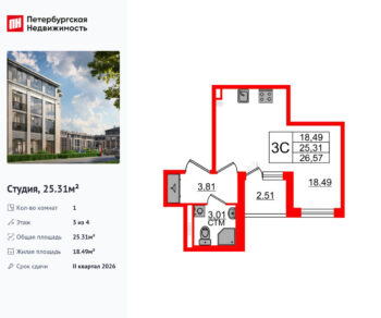 Студия, 25.58м2 на 2-м этаже от 7 550 039 ₽