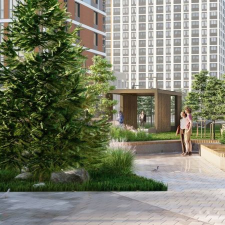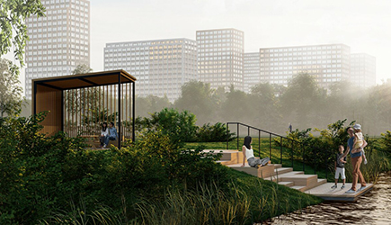 Жителей «Города звёзд» ждут преимущества для жилья комфорт-класса. Одно из них — единая входная группа. Благодаря акцентной отделке кирпичом и панелями под натуральное дерево она эффектно выделится на фоне фасада и вместе с этим гармонично впишется в природное окружение. В просторном холле предусмотрены ресепшен и зона ожидания с мягкой мебелью и авторским освещением.