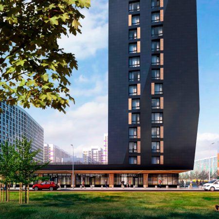 Витринное прозрачное остекление входных групп и холлы с высокими потолками, подсветкой и стильной отделкой продуманы до мелочей для светлого просторного пространства.