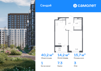 1-комнатная квартира, 47.61м2 на 6-м этаже